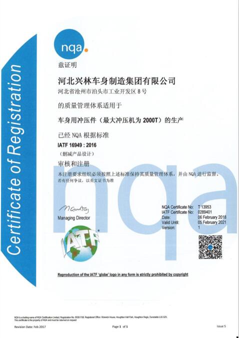 近日,經(jīng)過NQA的嚴格審定,河北興林車身制造集團有限公司順利通過了IATF(International Automotive Task Force)認證,并收到了IATF16949:2016質(zhì)量管理體系認證證書。
